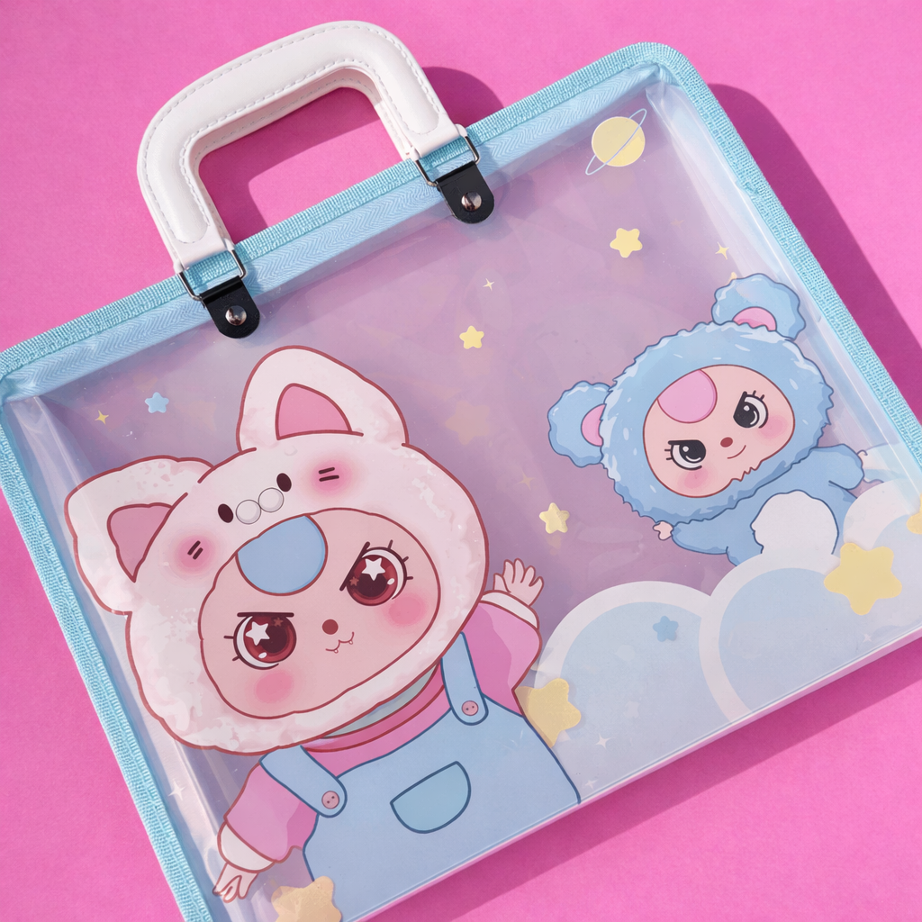 Mantén tus papeles organizados y seguros con esta práctica y adorable bolsa transparente Baby Three, ¡ahora con gancho para colgar donde quieras!