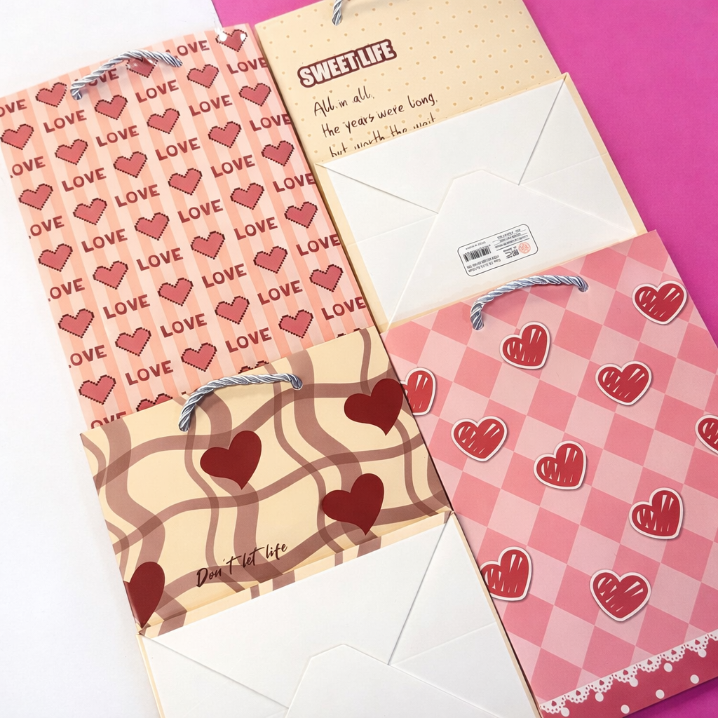 Con un tamaño práctico de 19.5 × 14.5 × 10 cm, es ideal para chocolates, peluches pequeños, papelería, accesorios y otros obsequios. Disponible en 4 modelos surtidos, cada uno con diseños amorosos y estéticos que se envían al azar.