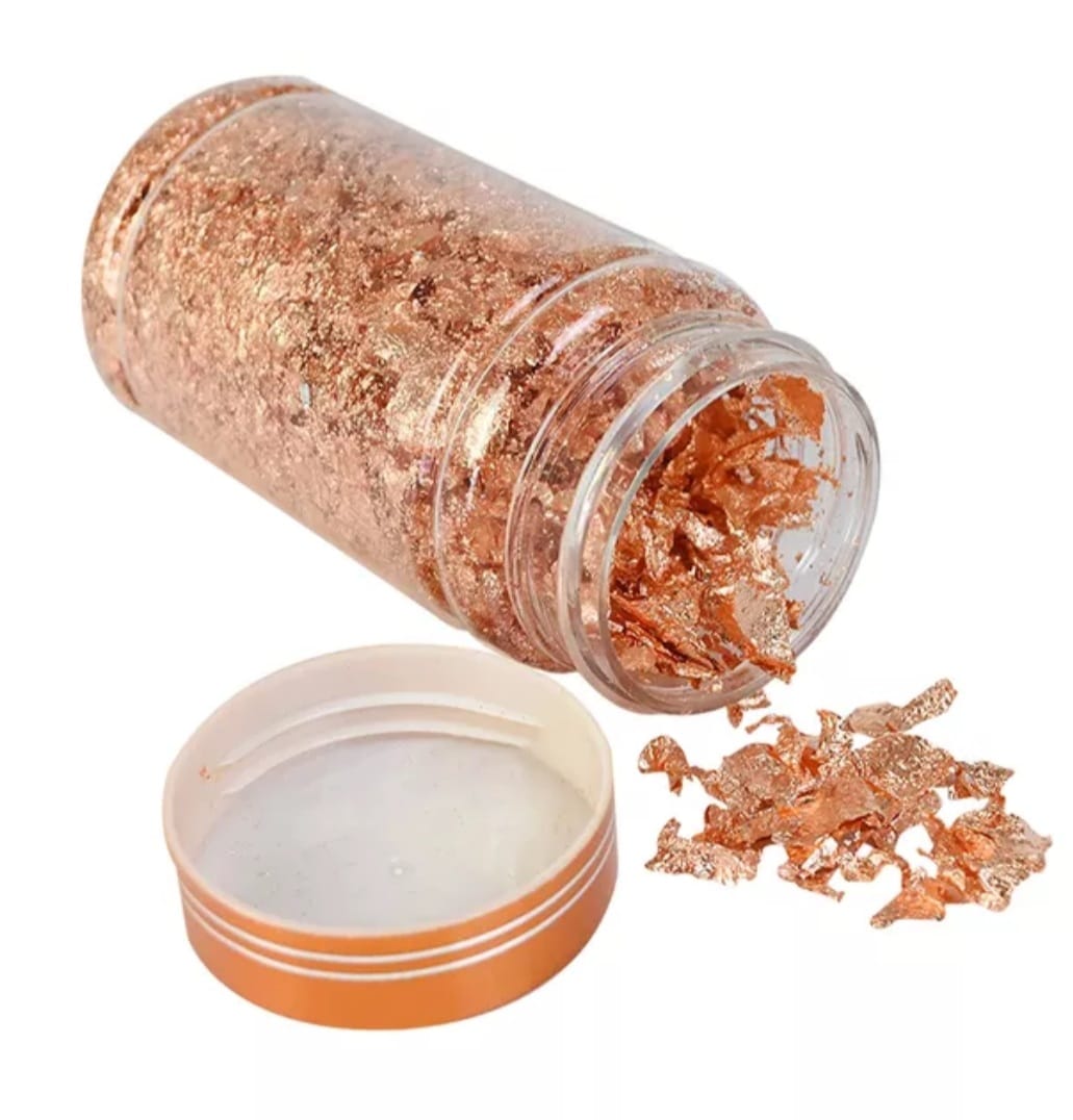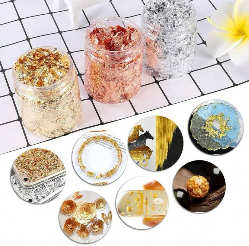Este set incluye una botella con láminas de resina trituradas en 3 colores deslumbrantes: oro, plata y cobre, los cuales se envían surtidos. Cada fragmento está diseñado para ofrecer un efecto brillante y elegante que transforma tus proyectos en piezas únicas. Perfecto para utilizar como relleno de resina o como detalle decorativo en diversas aplicaciones.